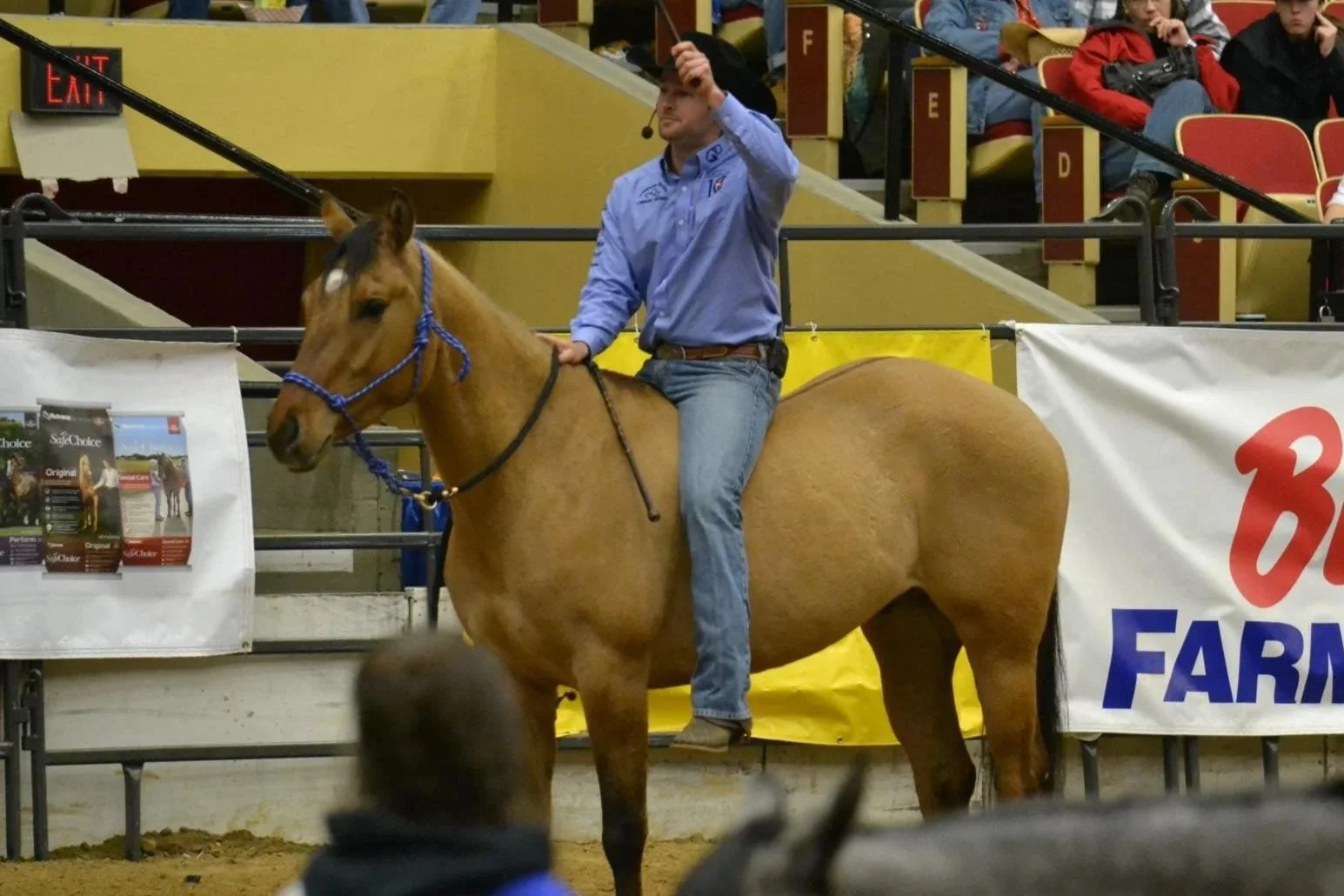 History: When Willy B was 3 years old he made an appearance at the Midwest Horse Fair! Willy B participated in a riding demo with Dan James of Double Dan Horsemanship. Dan James stood on Willy B's back and cracked a whip in the middle of the arena with spectators watching. Willy B patiently stood still for the demo like a pro.
